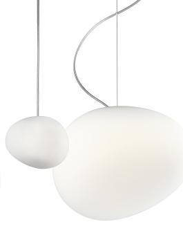 GREGGA simple yet pleasing boulder shape diffuser in blown satin glass on a wire suspension and with a transparent flex. The 12cm diameter ceiling rose is white lacquered metal. 3 sizes Grande 47cm diameter x 40cm height Media 31cm diameter x 26cm height Piccola 13cm diameter x 11cm height. Multiple drop suspensions are available to special order.