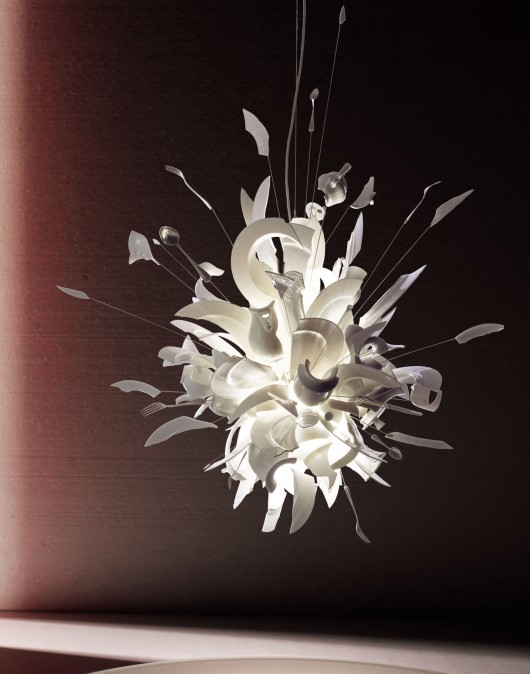 Porca MiseriaThe legendary and amazing 'Porca Miseria' ["Damn It"] is a limited edition light sculpture, hand-made by Ingo Maurer. This piece, that resembles an explosion of a place setting, comprises shards of white porcelain and cutlery mounted onto the ends of stainless steel rods. Only a handful of pieces have been made and even if your bank account is large enough, the 'maestro' has the last say on whether or not he will create one for you. Although it is unattainable by all but a few privileged clients we thought it worthy of inclusion as a classic piece.
