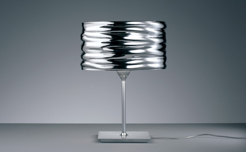 AQUA CILA table lamp with a hydroformed and mirror finished aluminium shade reminiscent of relections in water. The shade is supported on a diecast aluminium base and matt chrome on steel stem. The shade is available in various mirror finish colours. For direct up-down lighting. Family of luminaires.