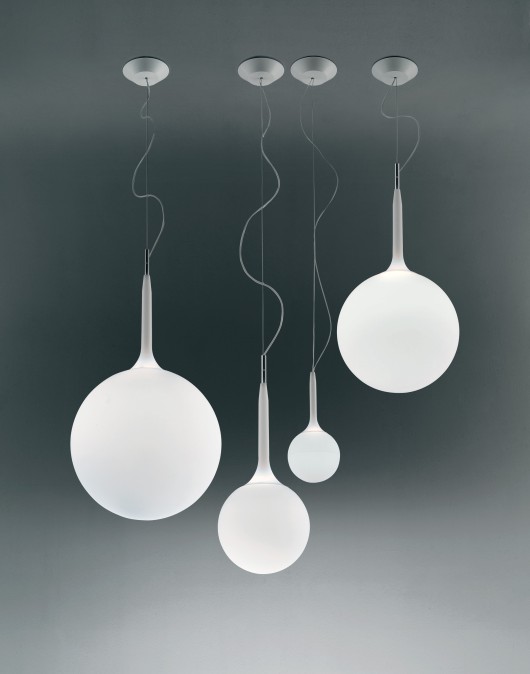 CASTOREA simple spherical diffuser in blown glass that flows from the tapering stem in a n elegant transition from suspension to light source. The 15cm diameter ceiling rose and stem are in thermoplastic resin and the glass is removable for lamp changing. Choice of diameters - 14cm, 25cm, 35cm, 42cm. Can be combined in groups for larger installations. Family of luminaires for diffused lighting