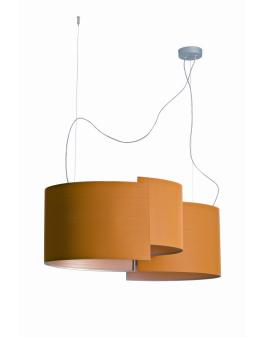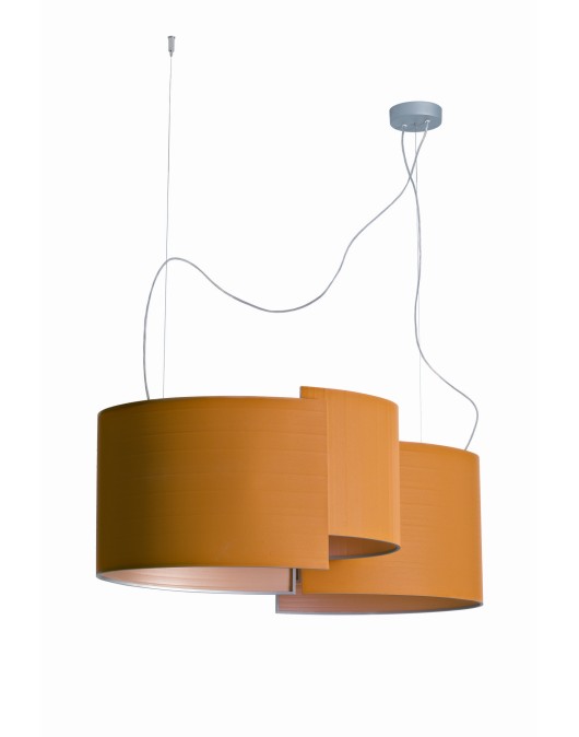 JOIINA pendant formed by interlocking curved planes that hide the light source from direct view. The textile used to cover the shades is finely coated with tiny beads of glass that give it a 'frosty' coating when viewed from certain angles and presents an attractive surface even when the light is switched off. Available in various sizes and some combinations. Family of luminaires. For diffused lighting.