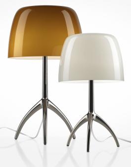 LUMIERE 05Rodolfo Dordoni served as artistic director of Foscarini from 1988 to 1993. During that time he created this futuristic table light which began as a quick sketch and became one of their best selling models. The blown glass shade sits on a polished aluminium or black chrome, three legged base. Two sizes. Big, Diameter 26cm x Height 45cm Small. Diameter 20cm x Height 35cm Family of luminaires for diffused lighting.