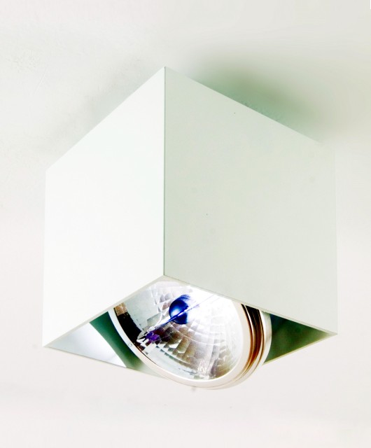 CUBO 111A surface mounted directional downlight using a halogen metal reflector AR111 lamp within an elegantly simple cube of extruded aluminium section. The fitting may also be semi-recessed or fully recessed using an adaptable mounting frame accessory in white or chrome finish The fitting has an integral transformer and is available in a range of standard finishes. Special finishes are available to minimum quantity orders. For directional lighting. Family of luminaires
