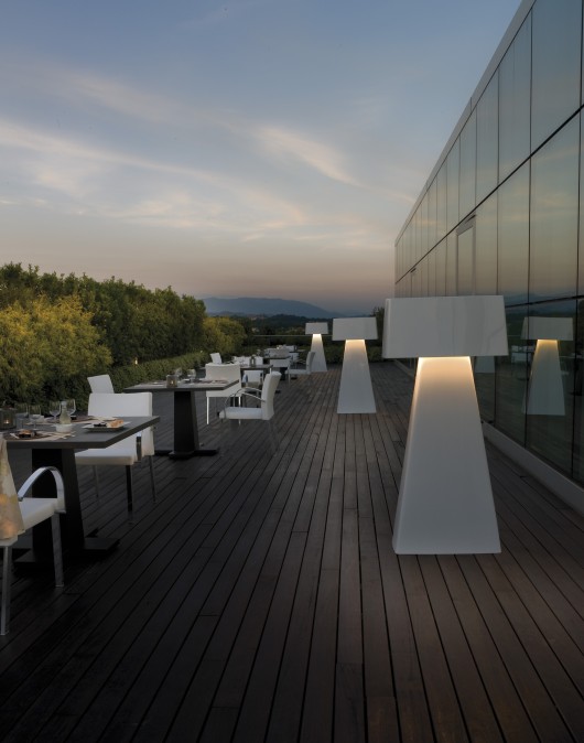 BAGOUTDOORA new floorstanding lamp for outdoor use, rectangular in shape and formed in thermo-plastic material with a high gloss finish. Family of luminaires in two sizes.