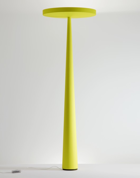 EQUILIBRE F3A striking floor lamp with a sculptural form. There is an elegant balance between the tapered stem and the large circular diffuser. Painted fibre-glass. Integral dimmer. Plug and lead 238cms. Uplight for indirect lighting