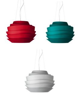 LE SOLEILA luminous sphere of layered bands of a polycarbonate material concealing the lighsource within yet allowing light to escape between them to create this glowing effect. Reminiscent of architectural forms such as the Guggenheim in New York and possible inspiration from earlier Louis Poulsen and Alvar Aalto designs for lighting. Illumination is directed upwards and downwards and the shade is suspended from a centre rose on a wire suspension. For direct and indirect lighting.