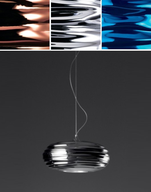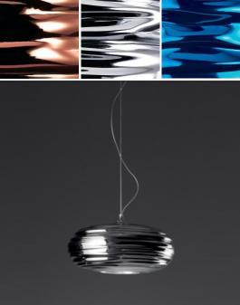 AQUAELL PENDANTOUT OF PRODUCTION - NOT AVAILABLE A pendant suspension lamp with a hydroformed and mirror finished aluminium shade. The shade is supported on a wire suspension from a die-cast aluminium ceiling rose daimeter 11cm and supporting structure. For direct and indirect lighting. Family of luminaires