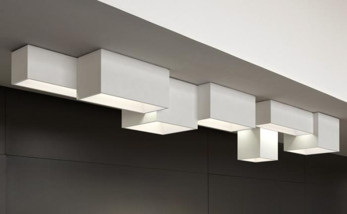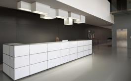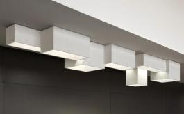 LINKLINK is a modular lighting product comprising four elements of different sizes and heights that link together, both mechanically and electrically, to form a wide variety of composite structures. Because each element may be connected to another electrically on any of the four sides, a single electrical connection is sufficient for a composite arrangement of up to a maximum of 25 elements. A fixing system allows each module to be accessed individually for maintenance and lamp changing. The compact fluorescent light sources are hidden from direct view and use the internal surfaces to reflect and distribute the light in an indirect way. The system may be dimmable using a DALI system. The module sizes are: L 80cm x W 40cm x H 40cm, L 100cm x W 30cm x H 30cm, L 60cm x W 60cm x H 50cm, L 40cm x W 40cm x H 70cm