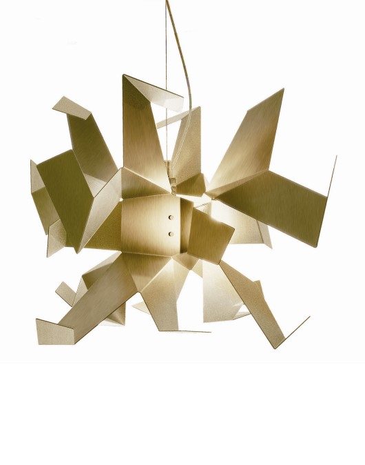 GLOWA suspended sculptural form in folded metal available in various finishes and singly or in multiple combinations of two, three or four units in a horizontal arrangement. Suspension cable 200cms. Family of luminaires sizes 22cm, 65cm [illustrated] and 85cm For a non-specific decorative lighting effect. THIS PRODUCT IS ON DISPLAY IN OUR SHOWROOM