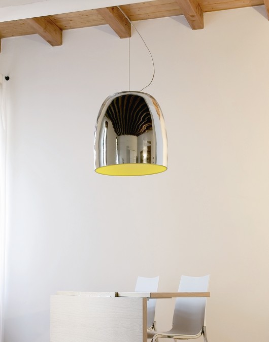 NOTTE S5A pendant suspension with a blown glass or metal shade on a chrome or brushed nickel metal structure. The satin white opal diffuser creates a diffused lighting effect and the black glass mirror glass and metal finish shades are for direct lighting. Energy saving product.and Part L compliant in fluorescent G24 versions with integral control gear. S5 36cm dia x 36.5cm H x 200cm max drop. Other sizes available Side mounting ceiling rose option available. NEWS 2011 : From June 2011 the NOTTE S3 and NOTTE S5 will be available in a Copper glass finish From October 2011 customisation of colours is available. Please contact us for more information