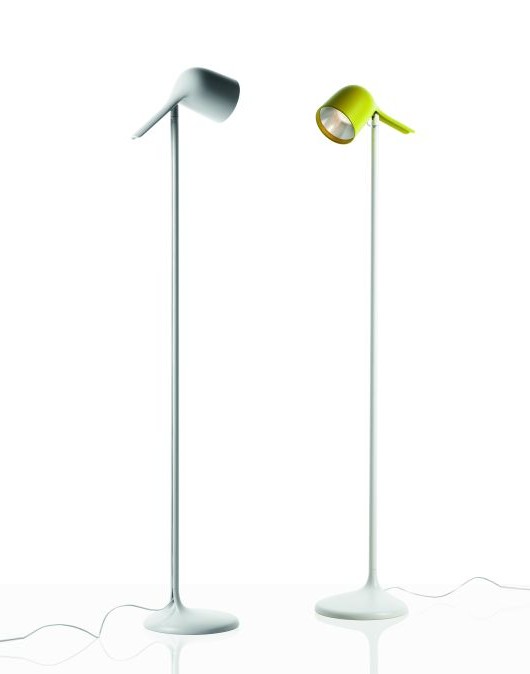 COLIBRINEW ! A simple, clean and elegant floor-standing lamp with an adjustable pivoting head. Suitable as a reading light or as an adjustable source of soft lighting to relieve a dark corner. Polycarbonate and metal construction with in-built dimming.