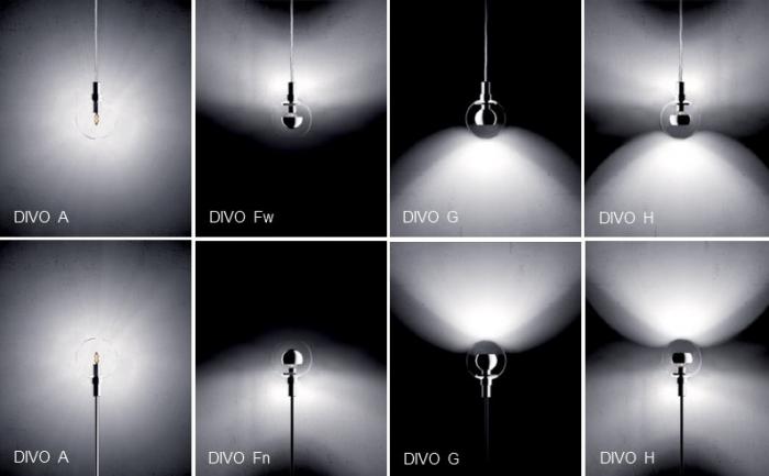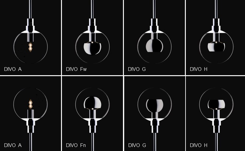 OCCHIO DIVO HEAD VERTICALThe basis of the DIVO is a glass sphere shade, either clear or satinised, with a metal reflector at its centre. The reflector is free to rotate through 360 degrees around the lamp enabling the light to be aimed in any direction around its axis. The system divides into 'vertical' and 'horizontal' types. Vertical applications include table and floorstand, ceiling mounted, and pendant suspension. Variations in reflector types determine the pattern of light created, ranging from a diffused non-direct pattern to specific cones of light with single or double directional distribution when used with a clear glass shade. The satinised glass shade provides a general diffused distribution The body types include wall, ceiling, floor, table, pendant and track-mounted versions in fixed or adjustable options.