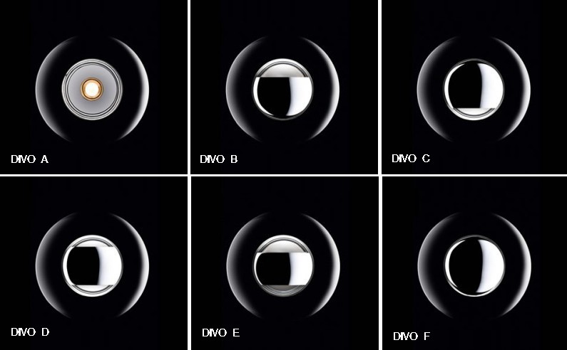 OCCHIO DIVO HEAD HORIZONTALThe basis of DIVO is a glass sphere shade, either clear or satinised, with a metal reflector at its centre. The reflector is free to rotate through 360 degrees around the lamp enabling the light to be aimed in any direction around its axis. The system divides into 'vertical' and 'horizontal' types. Horizontal types are used in wall mounted, floor-standing, ceiling mounted, and pendant suspension applications. Variations in reflector types determine the pattern of light created, ranging from a diffused non-direct pattern to specific cones of light with single or double directional distribution when used with a clear glass shade. The satinised glass shade provides a general diffused distribution. The mounting types include wall, ceiling, floor, table, pendant and track mounted versions and in fixed or adjustable options.