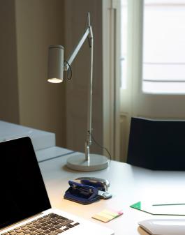POLOA minimalist adjustable table or desk lamp featuring LED technology. The jointed arm structure, in injection moulded aluminium, pivots on its base and allows full movement and positioning of the light. The rotary switch is mounted on the head. Can be base , clamp or wall mounted.