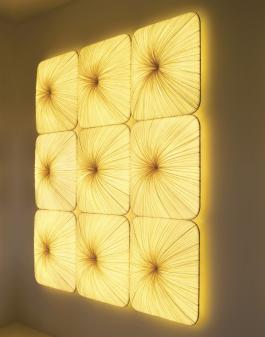 YOUNGA modular square wall or ceiling tile that may be built into a composition. Used in conjunction with FOREVER, a lozenge shape tile, a wide variety of compositions is possible. Each piece is made by hand in an exquisite selection of 16 hand dyed silks in colours Rust, Curry, Orange, Flame, Red, Dark, Gold, Silver, Smoke, Grass, Cream, Sand, Redwood, Shell, Stone, Coal. Note : The silk is hand-dyed in batches and colour matching cannot be guaranteed. Colours may fade after long periods in direct sunlight Family of luminaires. Compact fluorescent light sources [dimmable or non- dimmable]