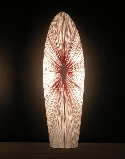 MAESTROFrom the Orchestra Collection this sculptural piece stands over two metres high and resembles a stone monolith. Each piece is made by hand in an exquisite selection of 16 hand dyed silks in colours Rust, Curry, Orange, Flame, Red, Dark, Gold, Silver, Smoke, Grass, Cream, Sand, Redwood, Shell, Stone, Coal. Note : The silk is hand-dyed in batches and colour matching cannot be guaranteed. Colours may fade after long periods in direct sunlight Energy efficient fluorescent light sources with dimming options.