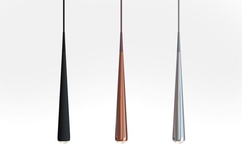 NICENICE is a minimalist suspension lamp in copper, polished aluminium or matt black aluminium with a colour matched cable. The LED light source has an optical lens that minimises glare. The fitting is equipped with a 1-10V dimmable driver within the ceiling box and a 'lightdim' switch intended for use with a 'push button' type dimmer . Alternatively the fitting can also be fited with A DALI dimmable driver at extra cost. Maximum drop overall is 2000mm The LED is 11W giving 450 delivered lumens colour temperature 2700K Also available in an array on a single ceiling plate Design Awards iF product design 2014 Interior Innovation Award 2014