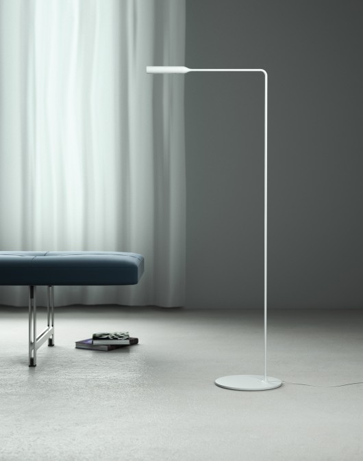 FLO FLOORAn elegant and minimal floor standing lamp on a circular base, constructed from aluminium. The head, containing a 6watt LED array delivering 475 lumens, rotates through 300 degrees to allow direct or indrect lighting and the stem pivots on the base through 120 degrees. A 3-level switch is mounted in the end of the head. The fitting is supplied with an adaptable plug/driver. The FLO is available in a range of matt colours including a 'soft touch' Black and metallic finishes Bronze, Gunmetal and Nickel. FLO is available in a complimentary range of applications including, BEDSIDE, DESK, and CLAMP, GROMMET or WALL mounting