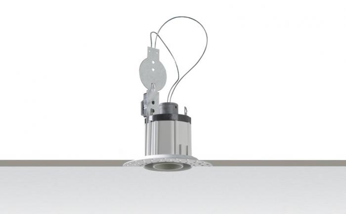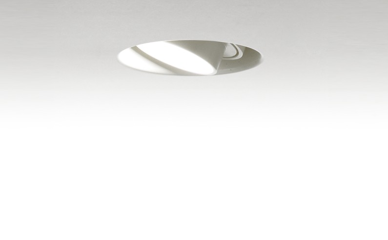 e01 ZEROA recessed adjustable, die-cast, aluminium alloy luminaire assembly for a completely frameless flush mounting and seamless integration into surfaces. The luminaire assembly comprises a special mounting plate which allows flush installation into plasterboard ceilings. The die cast aluminium body is designed to take a range of lamps and optical systems and can be moved forwards and backwards in the mounting to alter the visible cut-off. Adjustments allow 355deg rotation and 20deg tilt from the vertical position. A range of filters, lenses and anti-glare grids are available for luminaires with optics. Part of the elementi modular system. Part L compliant in the LED and Metal Halide versions