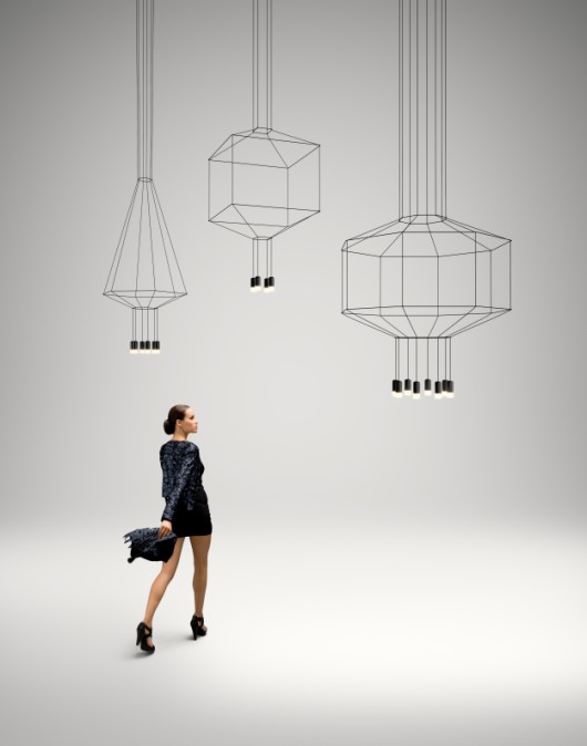 WIREFLOW COLLECTIONThe WIREFLOW collection designed by Arik Levy is a new take on a traditional chandelier and uses the fine cable supplying the power to the LED almost as a delicate drawn outline. The outlines create 2D and 3D space frames in a wide variety of geometric forms and suspended on the end of each line is a small LED light within a shade either with or without a pressed glass diffuser. Push, 1-10V or DALI electronic dimming, Each light has a 3.7W LED 350mA For details of the full range of options follow the link : www.vibia.com/en/lamps/show/id/02994/hanging_lamps_wireflow_0299_design_by_arik_levy.html