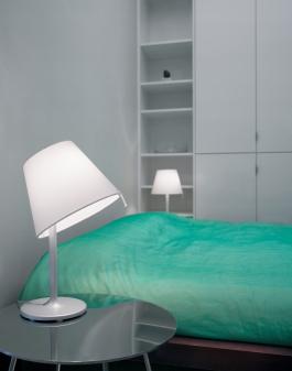 MELAMPOA table lamp in two versions, table and night-table with an adjustable silk satin diffuser supported on a cast aluminium base and aluminium painted aluminium stem. The table version adjusts to three positions - normal, angled to 34 degrees and rotated through 180 degrees. Size, shade diameter 35cm x base diameter 24cm x height 58cm - 84cm The night-table version adjusts to two positions - normal and angled to 30 degrees. Size shade diameter 23cm x base diameter 17cm x height 40 cm For diffused, direct and indirect lighting. Family of luminaires.