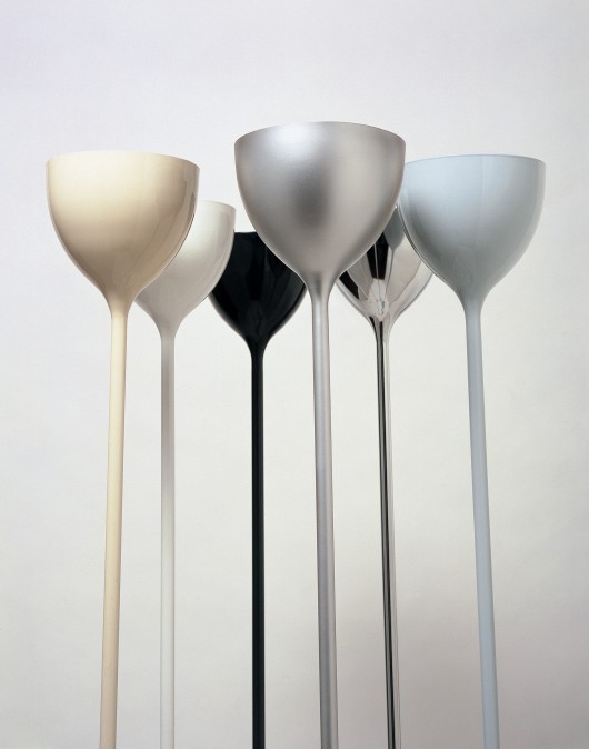 DRINKFloor standing uplight in chrome plated or painted metal with a "goblet" shaped reflector head on a slender stem. A transparent polycarbonate push button in the stem controls the integral dimmer. An elegant free-standing uplight solution for both modern and traditional interiors. For indirect lighting. Family of luminaires