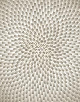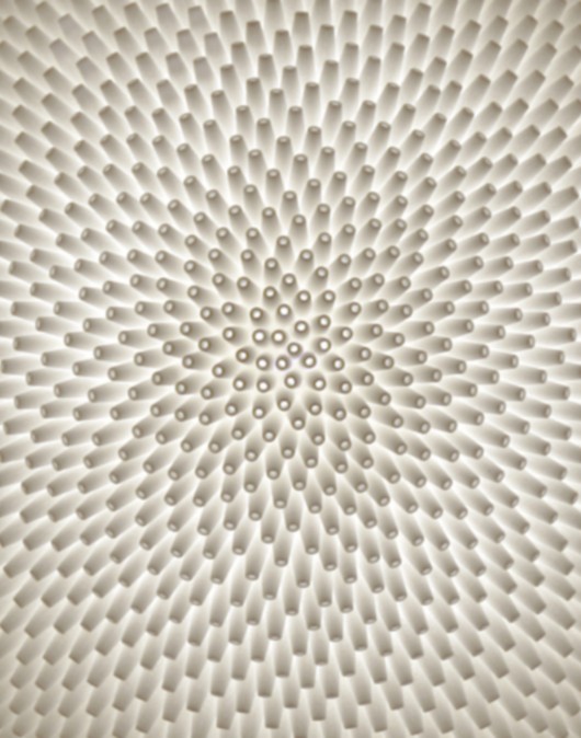 1597 DISCONTINUEDA wall light, or light object, formed by laser technology in polyamide. The form is based on the fibonacci series of numbers widely found in nature, the seed head of the sunflower or cone flower being good examples. The designer Janne Kyttanen began his studies in Barcelona followed by the Gerrit Rietveld Academy in Amsterdam from which he graduated in 2000. His thesis dealt with the use of digital manufacturing processes and rapid manufactured products and on this basis he set up his company FOC, based in Helsinki Finland. 1597 has won several awards including the Interior Innovation Design Award 2006. Medium -Diameter 32cm x height 16cm, Large- diameter 50cm x height 16cm NEW ! 1597 ECO diameter 50cm x height 8.4cm 13W CFL REGRETTABLY THIS PRODUCT IS DISCONTINUED