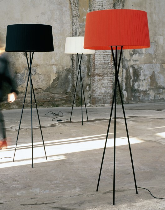 A tripod stand in tubular metal, finished black with a ribbon drum shade in a choice of colours. In-line foot dimmer. Family of fittings. For localised direct and diffused lighting.