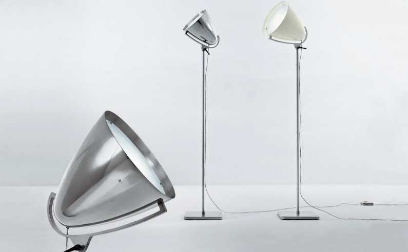 FARO FLOORFloor lamp on a steel base and stem with an adjustable head. The shade is aluminium with diffuser. In-line dimmer. Available in two sizes 35cms and 28cms, For diffused wash lighting.