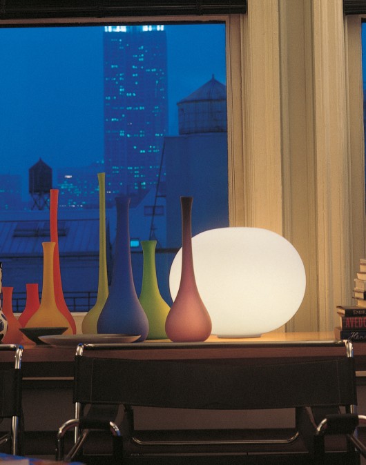 GLO-BALL BASICA minimalist sphere in acid etched, hand blown, opaline glass and diecast and white polyamide base ring and lamp holder. In-line dimmer on 190cm white flex. Two sizes diameter 33cm [illustrated] and diameter 45cm Family of luminaires.