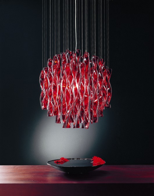 AURA suspensionThis spectacular range of fittings is created around double-layered strips of glass that are twisted by hand into individual spirals. The spirals are suspended individually on fine suspension wires from a ceiling plate and are combined into three dimensional sculptural forms. This pendant suspension version forms a spherical shape with either single or double clusters 47cm or 60cm in diameter. Family of luminaires.