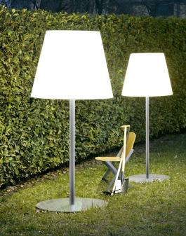 AMAXA floor lamp for outdoors. The cast iron base for weight and stability has a painted aluminium stem supporting a white translucent diffuser. It is supplied with 500cm cable and plug-in protection class IP44. Please take note of the sizes ! These are large scale fittings In two sizes, shades 82 & 109cm diameter x height 205 & 240cm