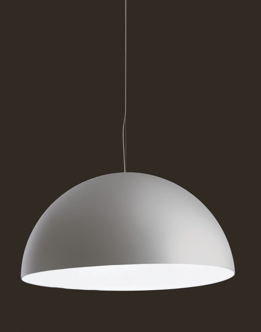 AVICOA large pendant half sphere in polyethylene, finished white on the inside and a choice of standard finishes on the outside, white , silver or black. Also available on request in metallic silver or gold finish. The ceiling rose is polished chrome with a steel wire suspension and blue fabric covered flex. Available in two sizes, diameter 120cm and diameter 160cm For diffused lighting. Energy saving product. Part L compliant in fluorescent G24 versions.