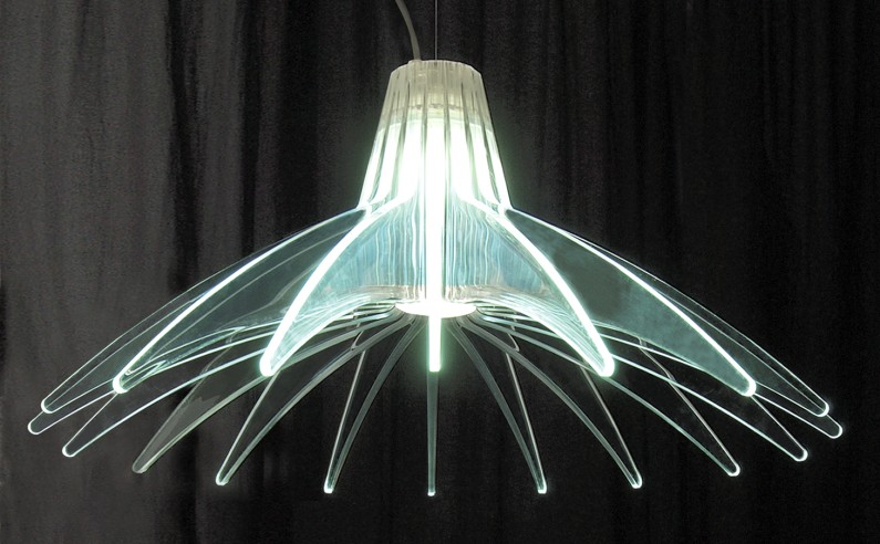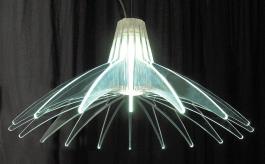 AGAVEA sculptural form using reflection and refraction of the fluorescent light source through radial ribs of injection moulded transparent methacrylate. Polycarbonate ceiling rose and body. Family of luminaires, 3 diameters, 17cm, 26cm, 70cm [illus]. Energy saving product for direct and diffused lighting. Part L compliant