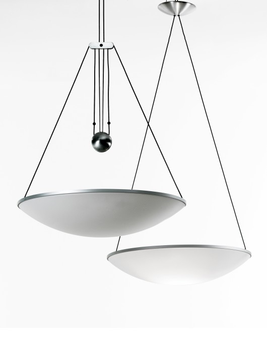 TRAMAA simple silk-screened polycarbonate diffuser bowl.on a fixed or rise and fall suspension using a counter-weight. Family of luminaires. Two diameters 50cm & 64cm. For diffused direct and indirect lighting. Energy saving product and Part L compliant in fluorescent versions