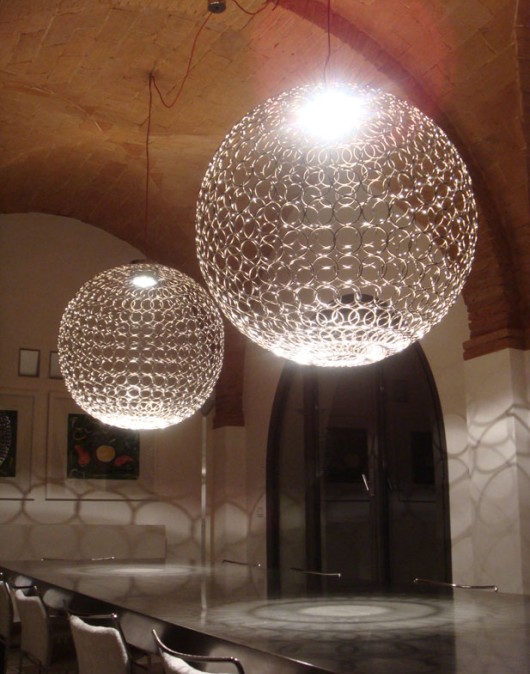 G.R.A.A decorative pendant suspension comprising a sphere constructed from individual metal rings welded by hand to form an open basketwork with a light source in the top. The sphere is on a wire suspension with a coloured braided flex. The combination creates a distinct pattern of light and shade. Maximum suspension drop 2.90M