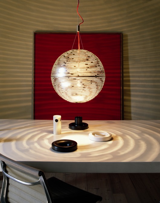 MAGDALENAA decorative pendant sphere formed in metal sheet and cut using a 3D laser technology and with a single light source within to produce an interplay of light and shadow effects. Two sizes. 70cm diameter or 50cm diameter. Maximum suspension drop 190cm with coloured braided fabric flex. Family of luminaires for decorative effect lighting.
