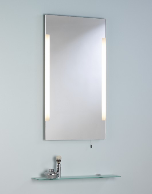 IMOLAA plain silvered bathroom mirror with acid etched strips with integral lighting to each side. Rated for bathroom use zones 2 & 3. Intergral cord pull.