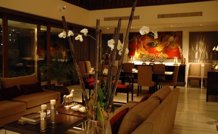 Malabar Hill is a highly prestigious residential area on the highest point in southern Mumbai and the apartment on the fifth and sixth floors, with panaramic views over the bay, underwent extensive refurbishment. Although essentially modern in its interior architecture it had many inherent traditional decorative elements.